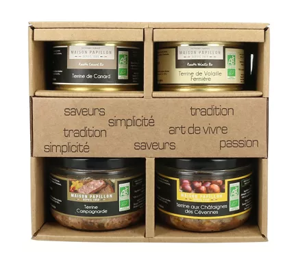 Une invitation à redécouvrir le goût vrai à travers une sélection 100 % biologique signée Maison Papillon. Ce coffret réunit des recettes authentiques et généreuses : la rusticité d’une terrine campagnarde, la finesse de la volaille, la richesse du canard et la douceur des châtaignes.