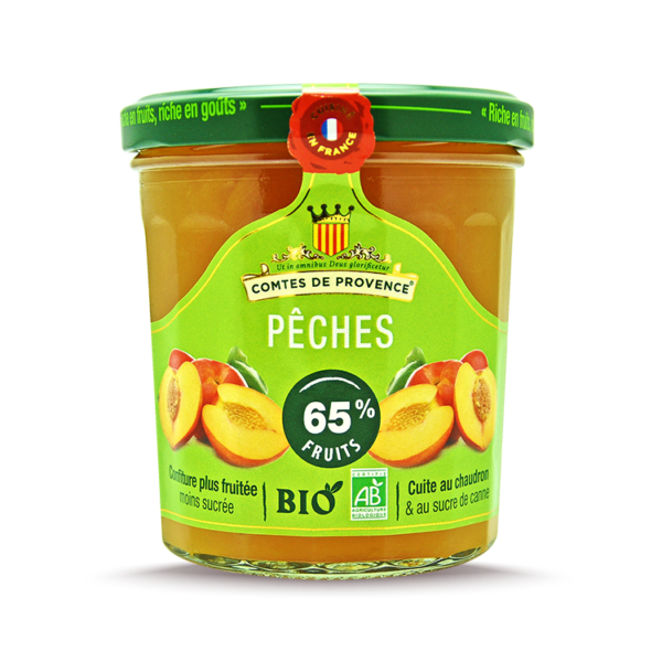 Pêche* (64%), Sucre de canne*, Gélifiant: pectine de fruits, Acidifiant: jus concentré de citron*. (* Issus de l’agriculture Biologique).