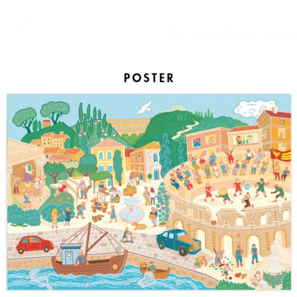 Voyager dans le temps est désormais possible. En superposant les pièces du puzzle sur le poster représentant une ville de provence on découvre la même ville dans l’Antiquité. Un jeu de puzzle au concept unique !
