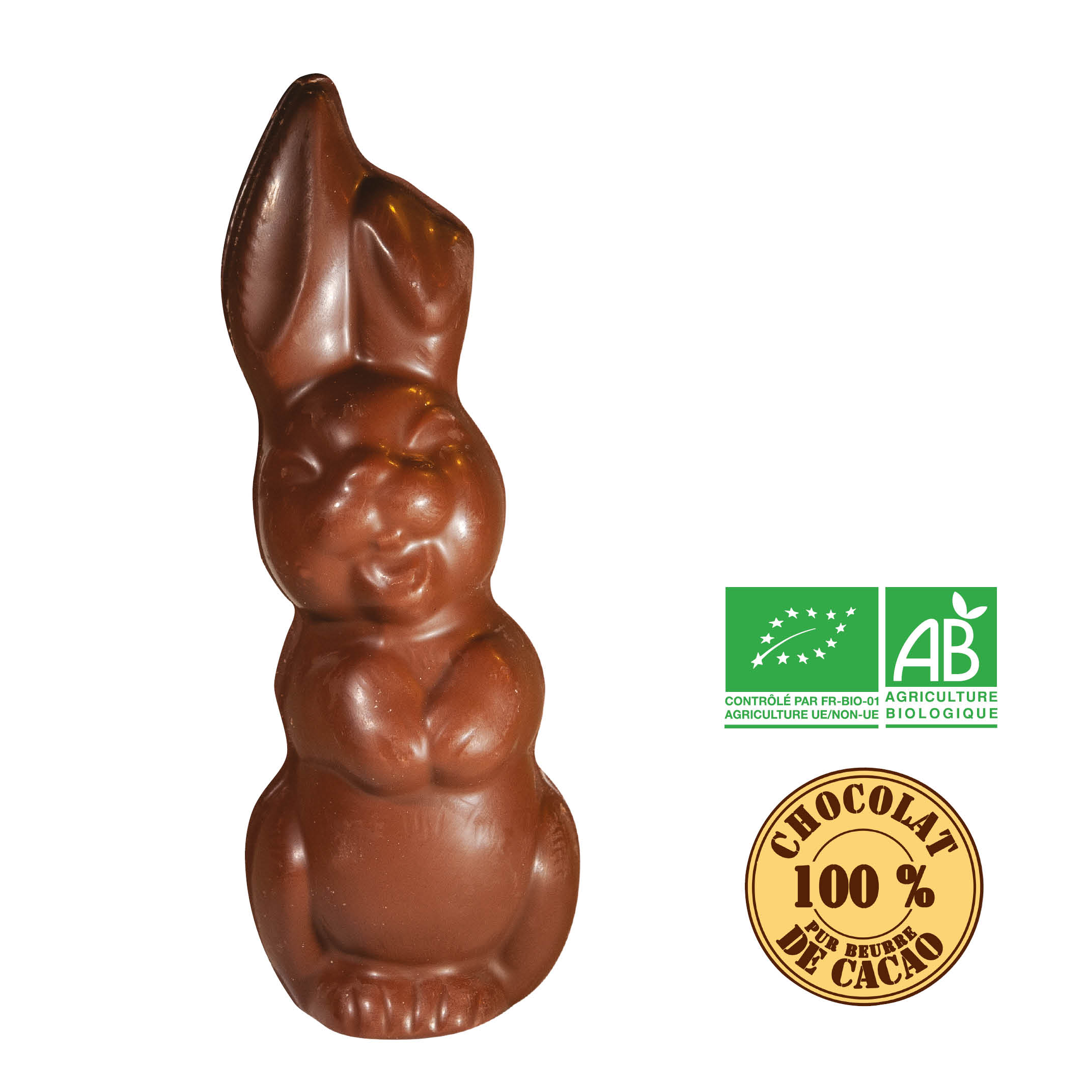 Moulage chocolat au lait 39% Bio – Lapinou – Hauteur 17cm.
