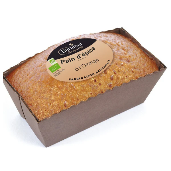 Farine de blé semi-complète*, miel*, sucre de canne non raffiné*, cubes d’oranges confits*(7%)(écorces d’orange*, sucre*, sirop de riz*), beurre*, eau de fleur d’oranger*, poudre à lever: bicarbonate de soude, sel de Guérande, épice*.